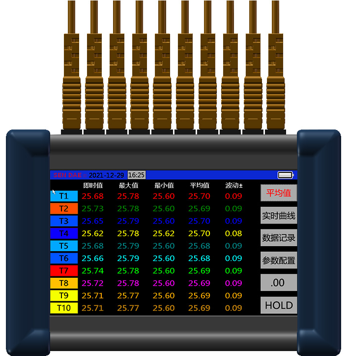主機接入溫度傳感器建議選擇SENDTA專用的探頭,整體精度有保證本機直接接入1~10 通道傳感器,以接入傳感器類型定義儀器名稱主機可定制報警信號輸出,數(shù)據(jù)無線 (通用無線頻道,4G上云)輸出內(nèi)嵌分析軟件及專屬分析軟件定制 (比如計量規(guī)程分析軟件)4.3"